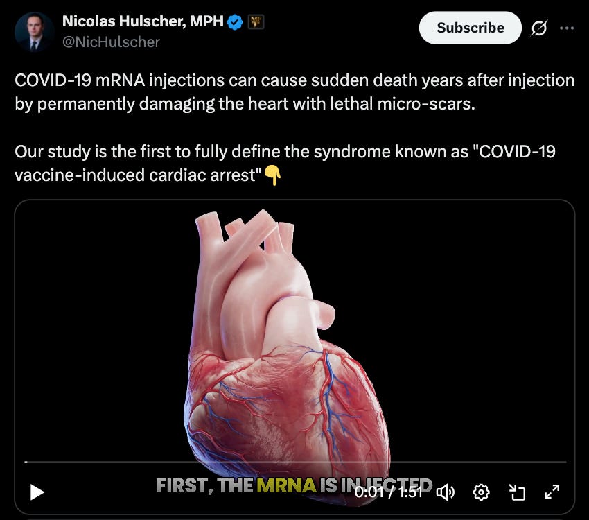 The post further alleges that COVID-19 mRNA injections can result in sudden death years after administration due to permanent cardiac damage.