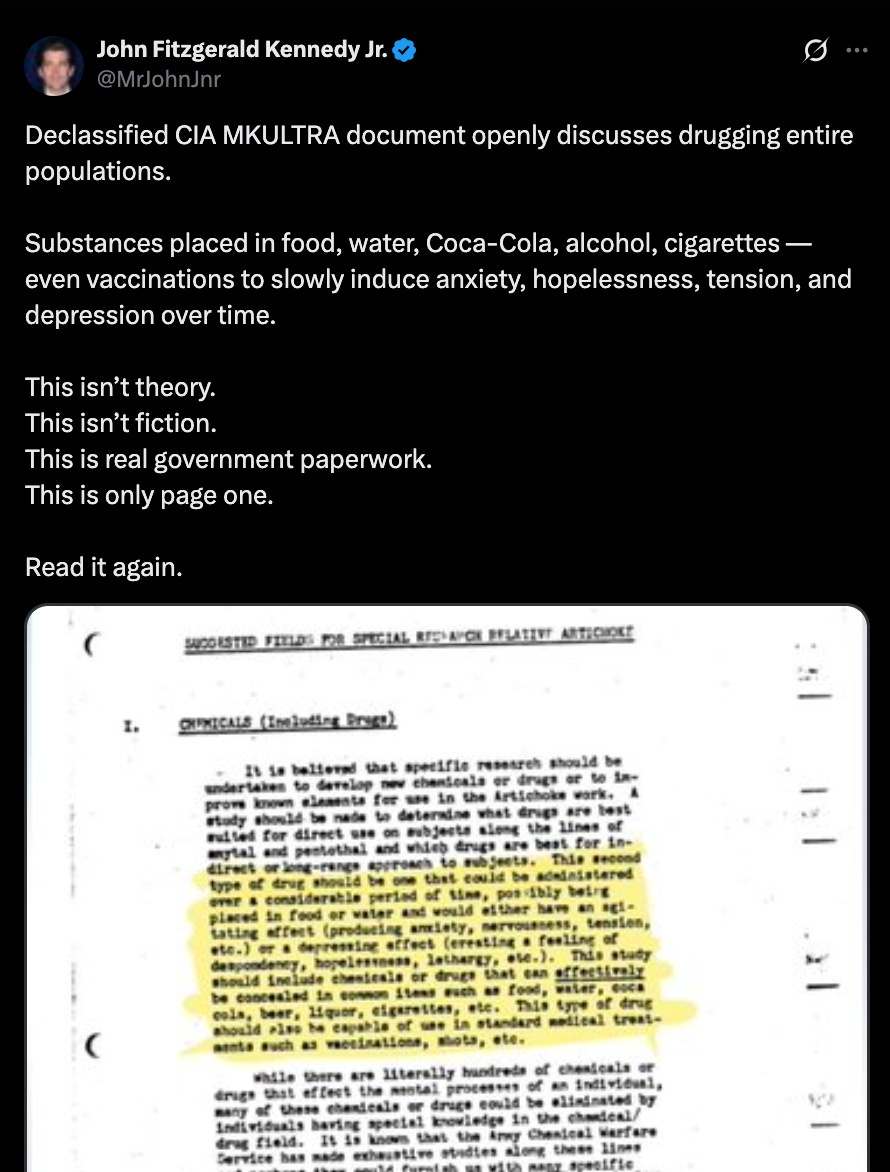 The document suggests such compounds could be slipped into food, water, alcohol, or cigarettes—everyday items that could become vectors for covert experimentation. It even floated the idea that these substances might be concealed within routine medical treatments, including injections.